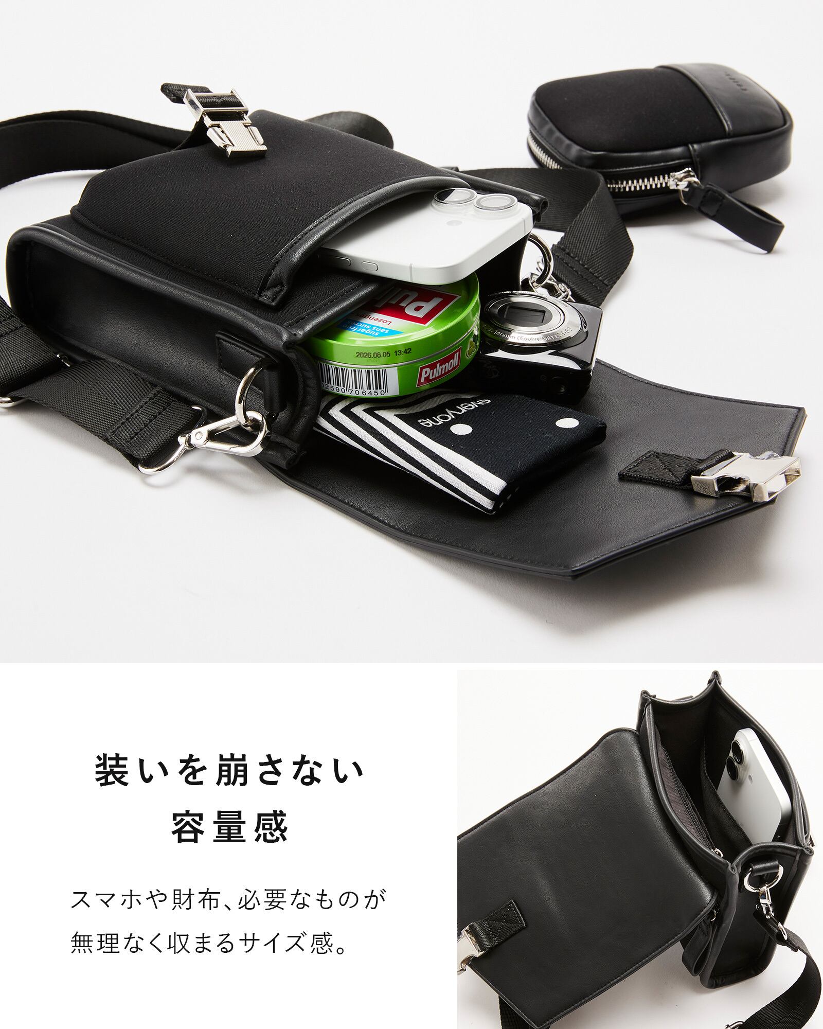 スマホ・財布・ポーチなど、必要最低限がすっきり収まるサイズ感。