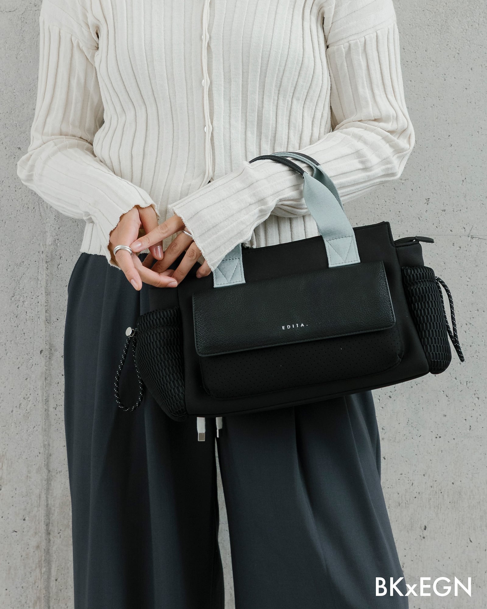 カジュアルにもモードにも、どちらにも合わせやすいバックです。