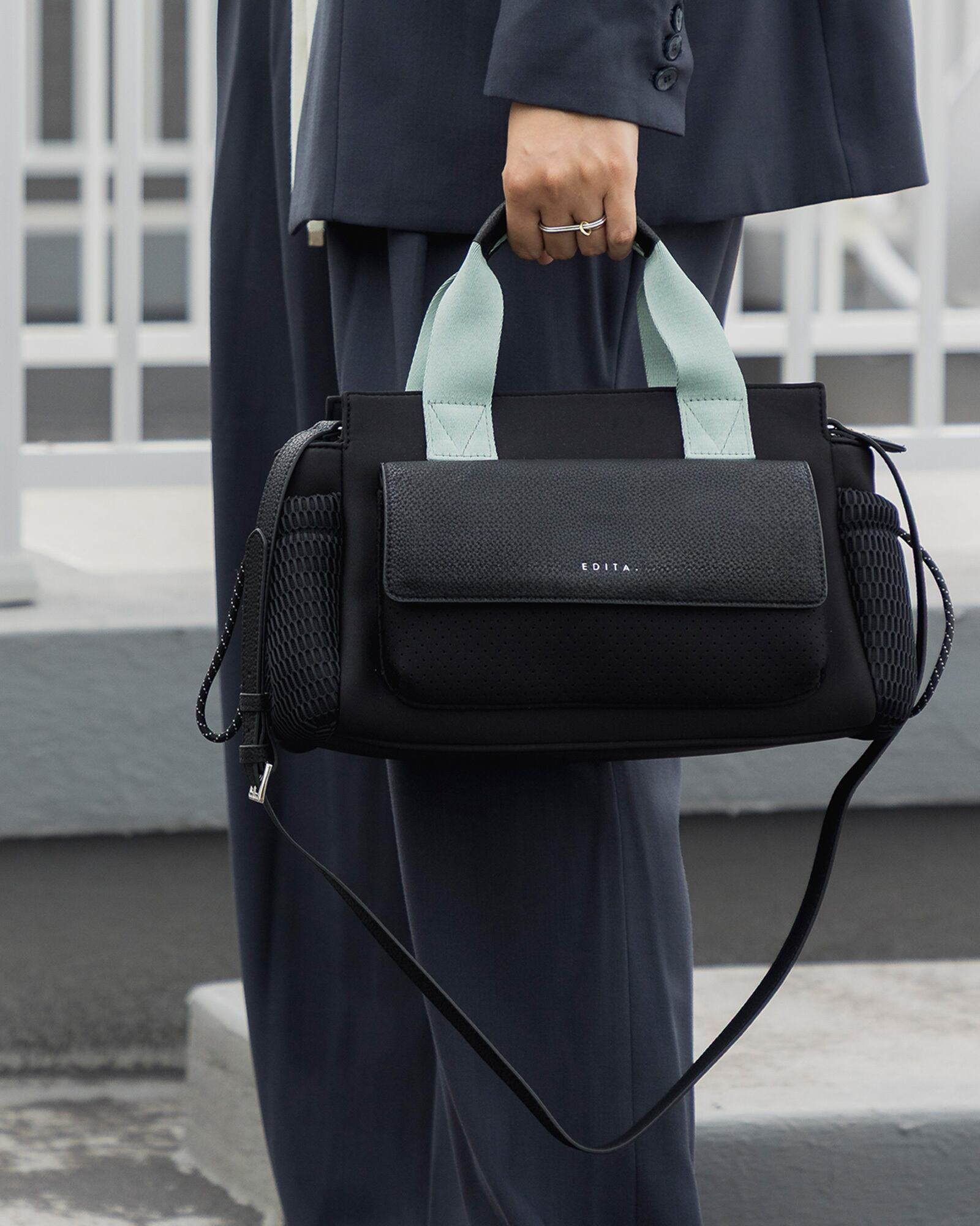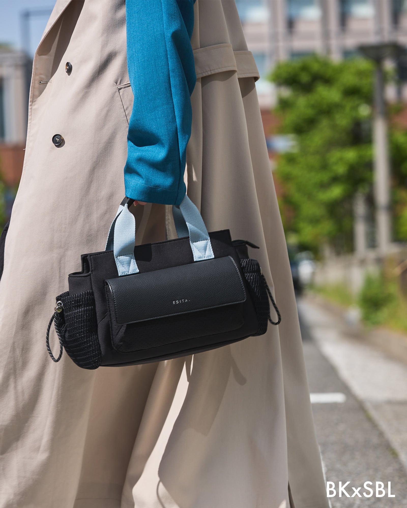 膝に乗せた時に横にはみ出しすぎず、お弁当箱も入るマチ幅なので、通勤バッグとしても。