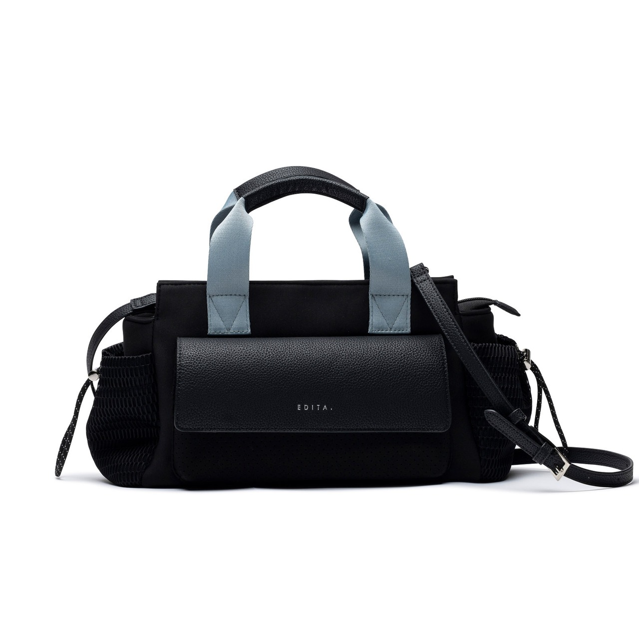 トレンド感ある横長フォルムとフロントのレザーポケットがモード見えするバッグ。 持ち手の色が差し色がキャッチ―でスタイリングのポイントに。こなれ感があってカジュアルにも大人モードスタイルにも合わせやすい。 長財布やペットボトルも入る見た目以上の収納力。