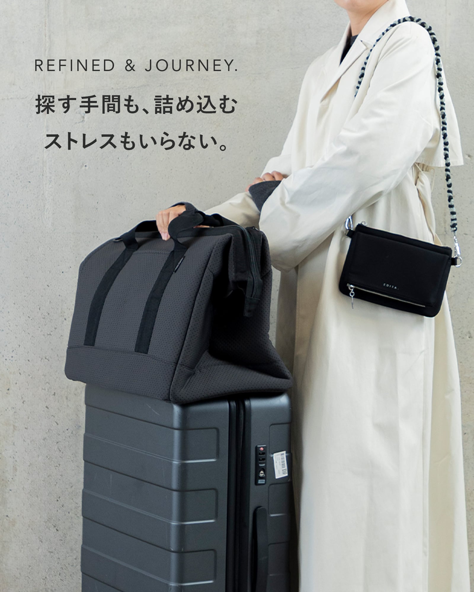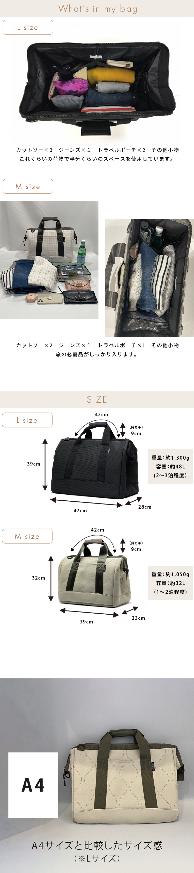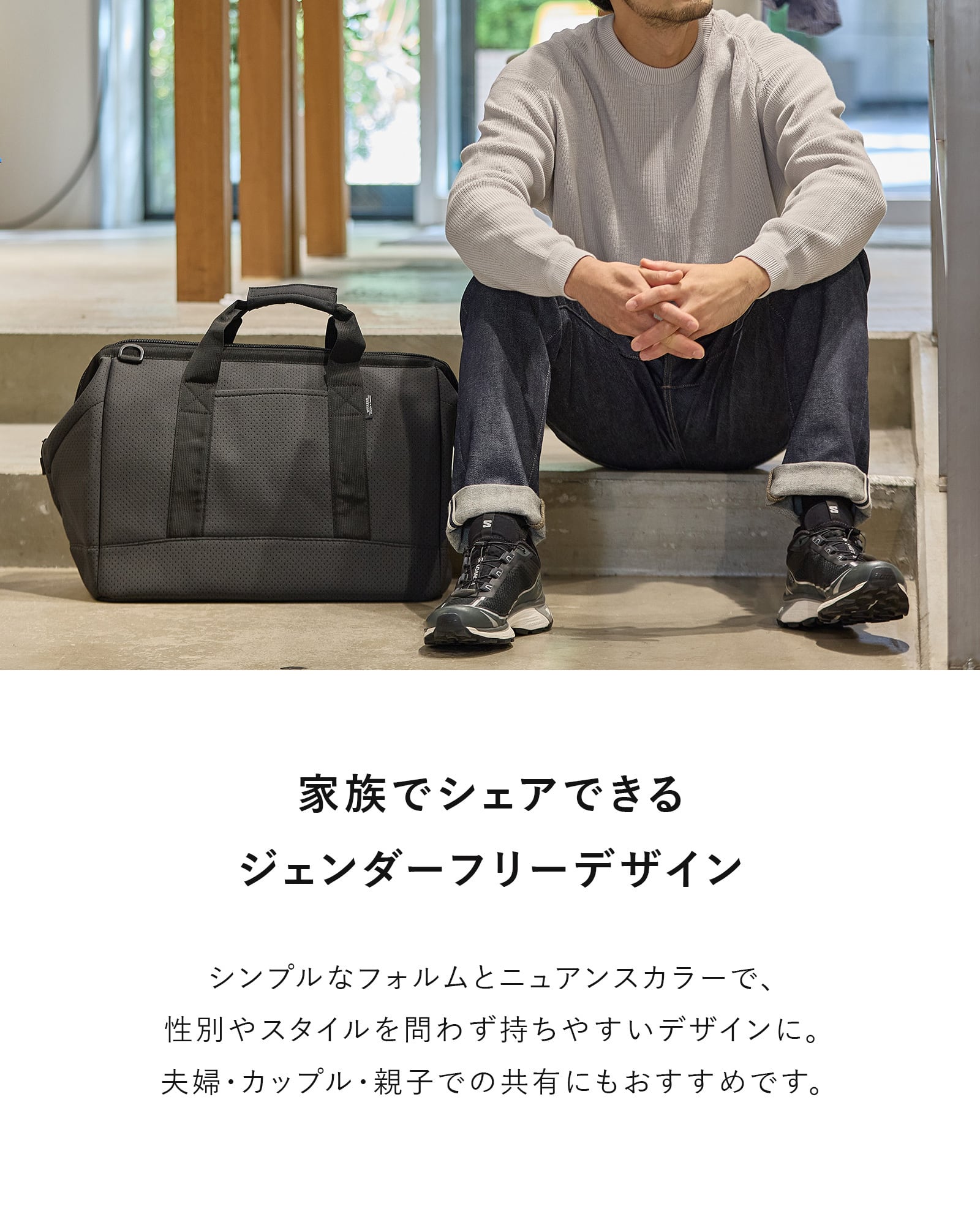 口枠式でがばっと開き、中が見やすいネオプレンボストン。旅行や帰省、出張はもちろん、出産入院の準備品としても。シンプルデザインで兼用使いでき、コンパクトに折りたためて収納に場所を取りません。中にポケットがあるのでなにかと物が増えてしまいがちな旅行中も、物が迷子にならず整理しやすいのが魅力。