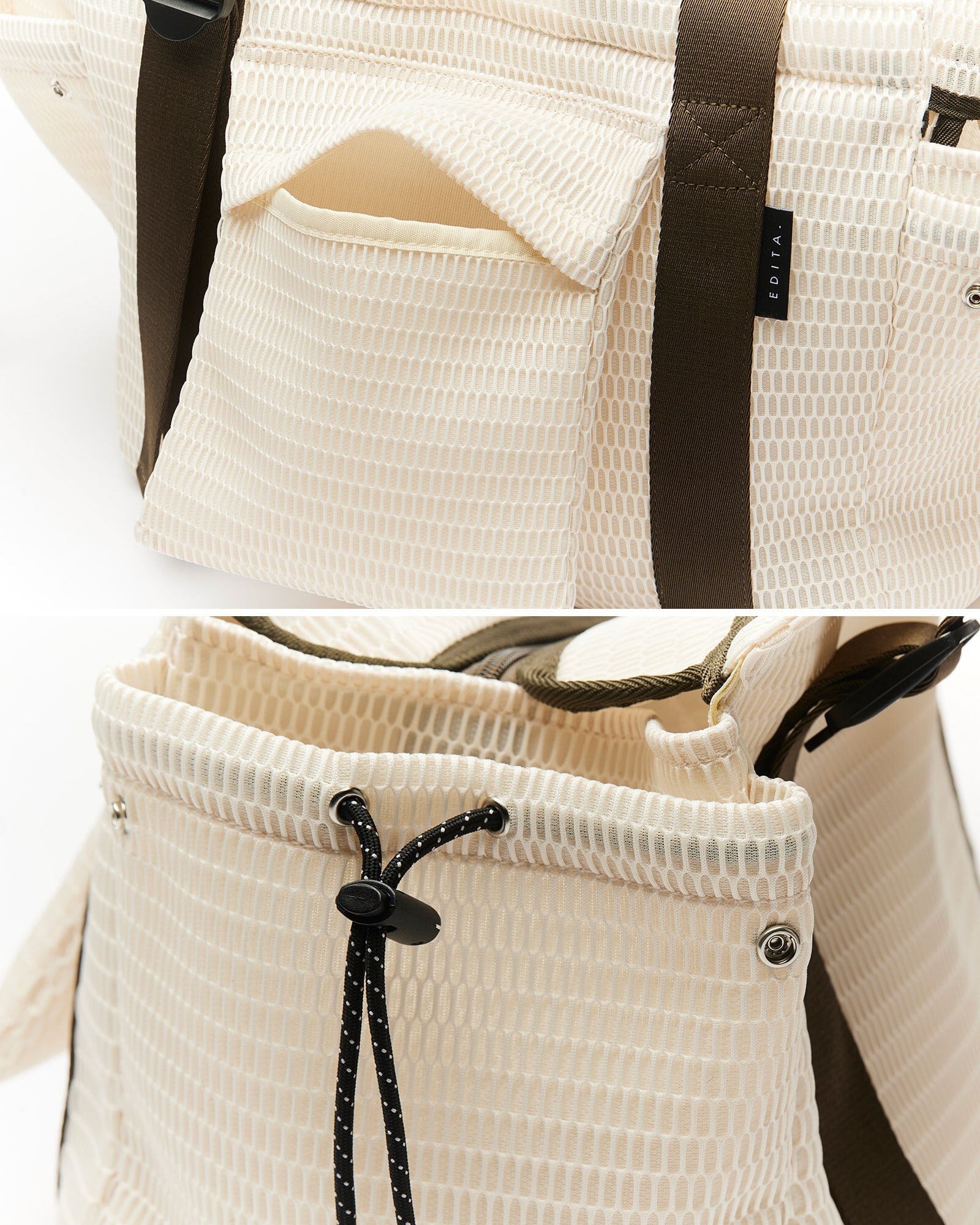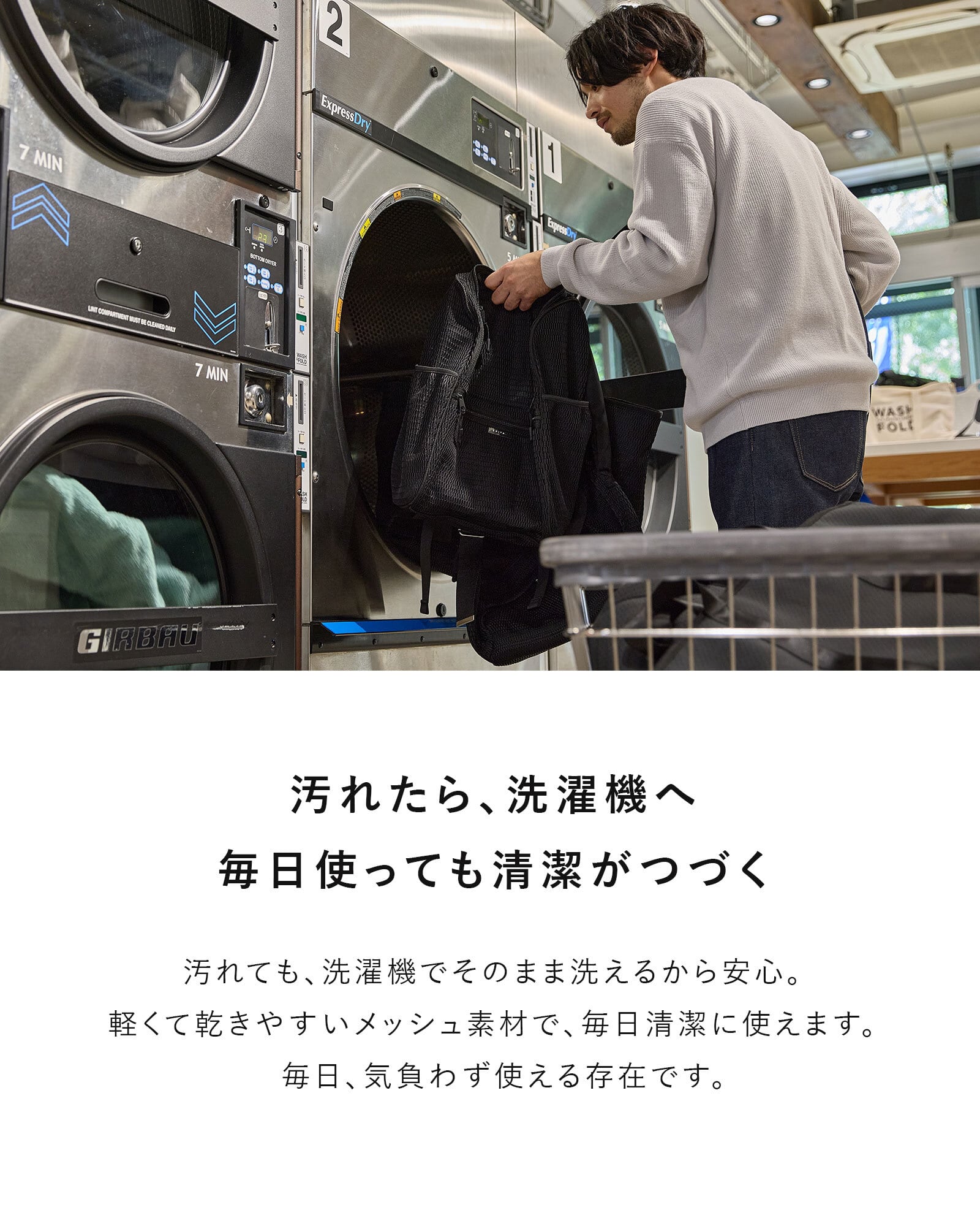 サンダルやオフィスチェアにも使用されるメッシュは柔らかくて畳みやすく、しわになりにくい生地感。