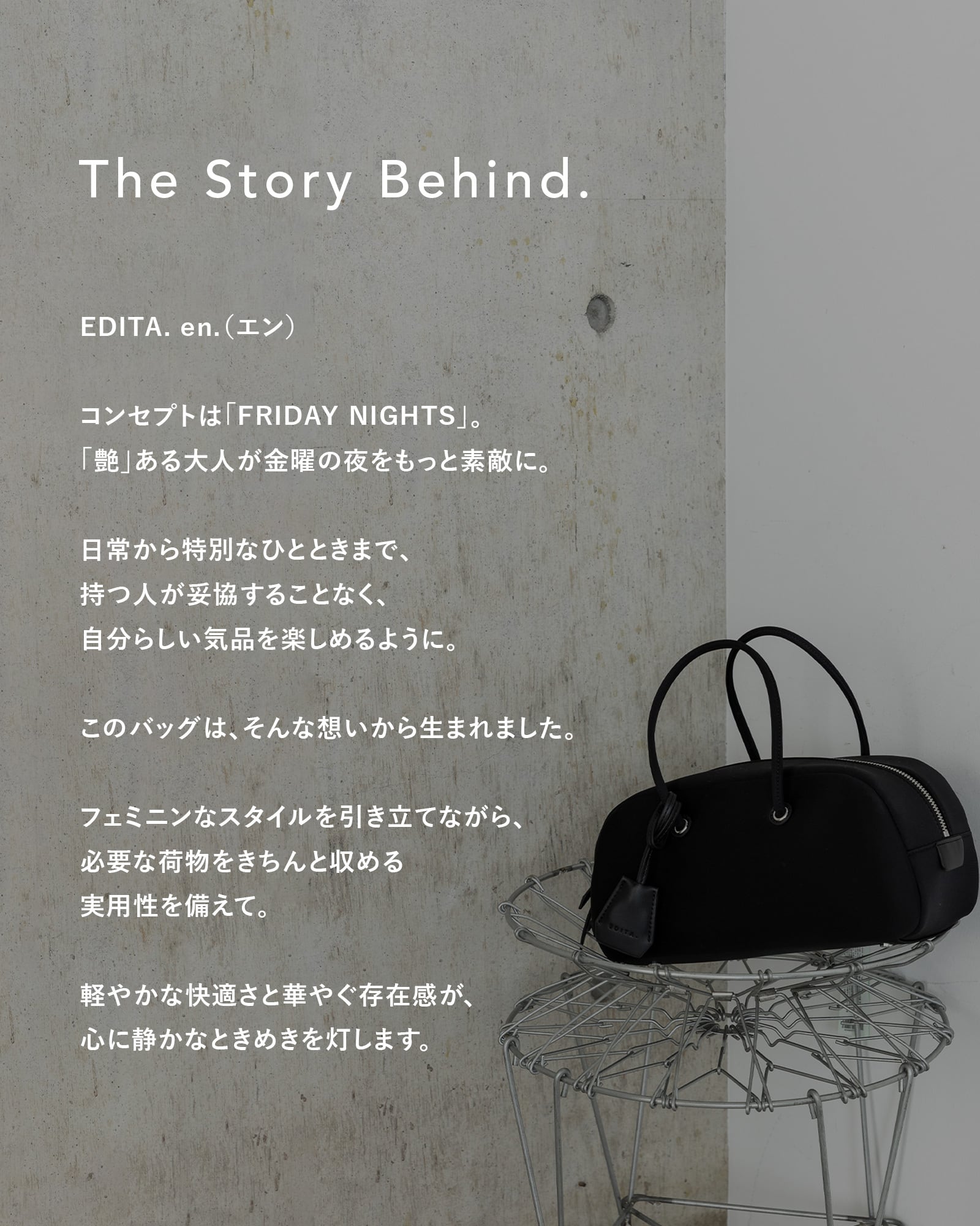 膝に乗せた時に横にはみ出しすぎず、しっかりお弁当箱も入るマチ幅なので、通勤バッグにも。