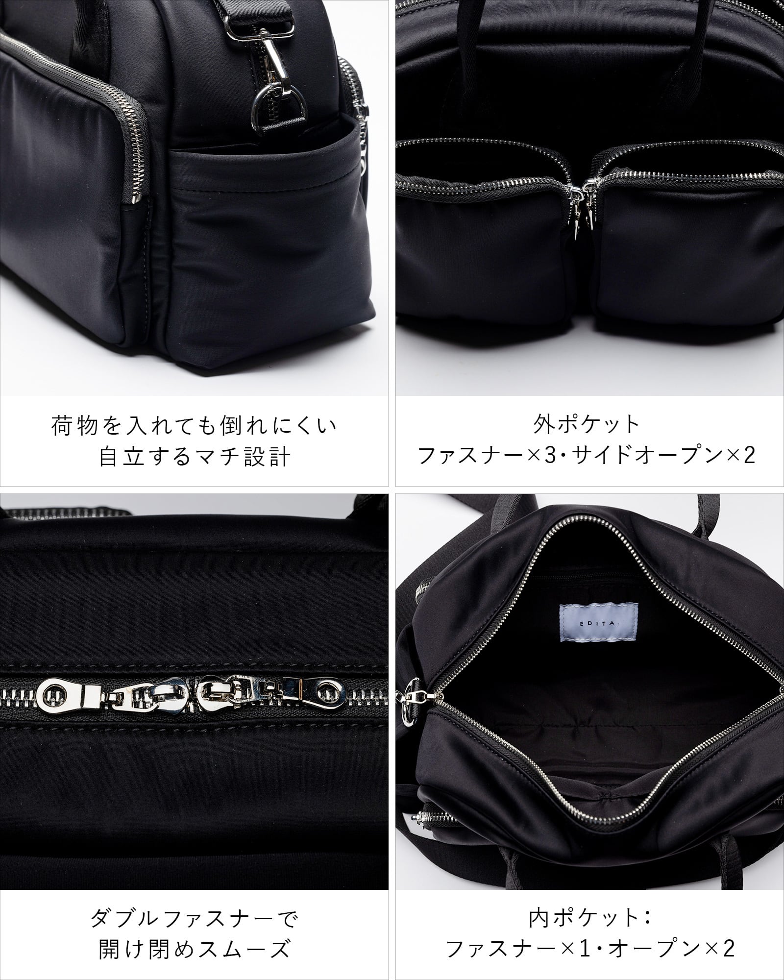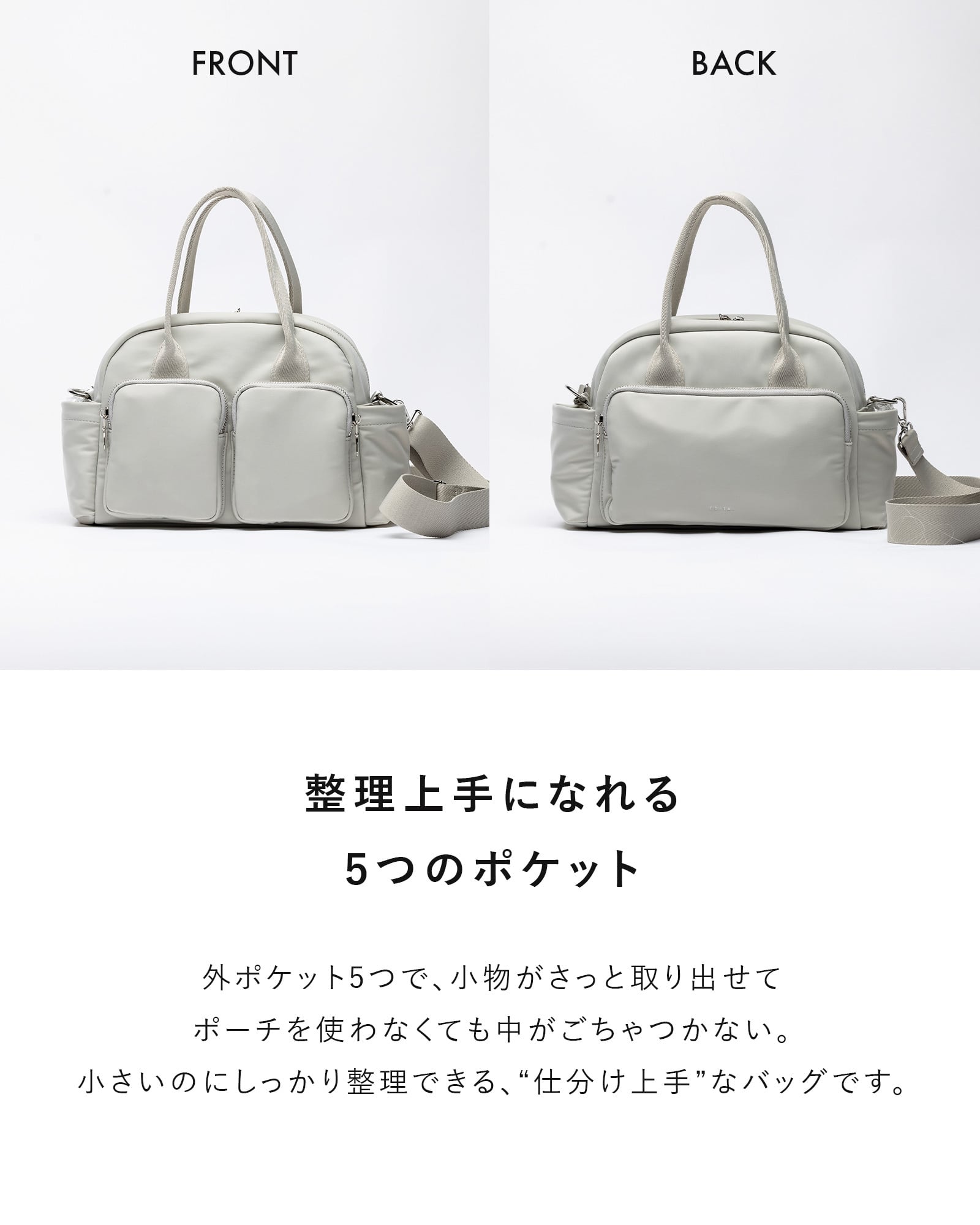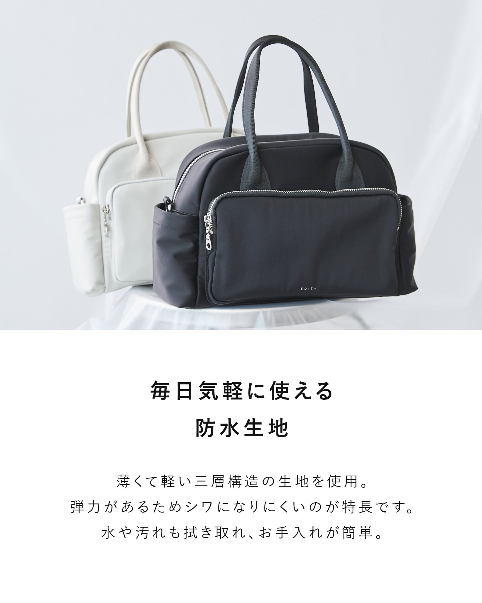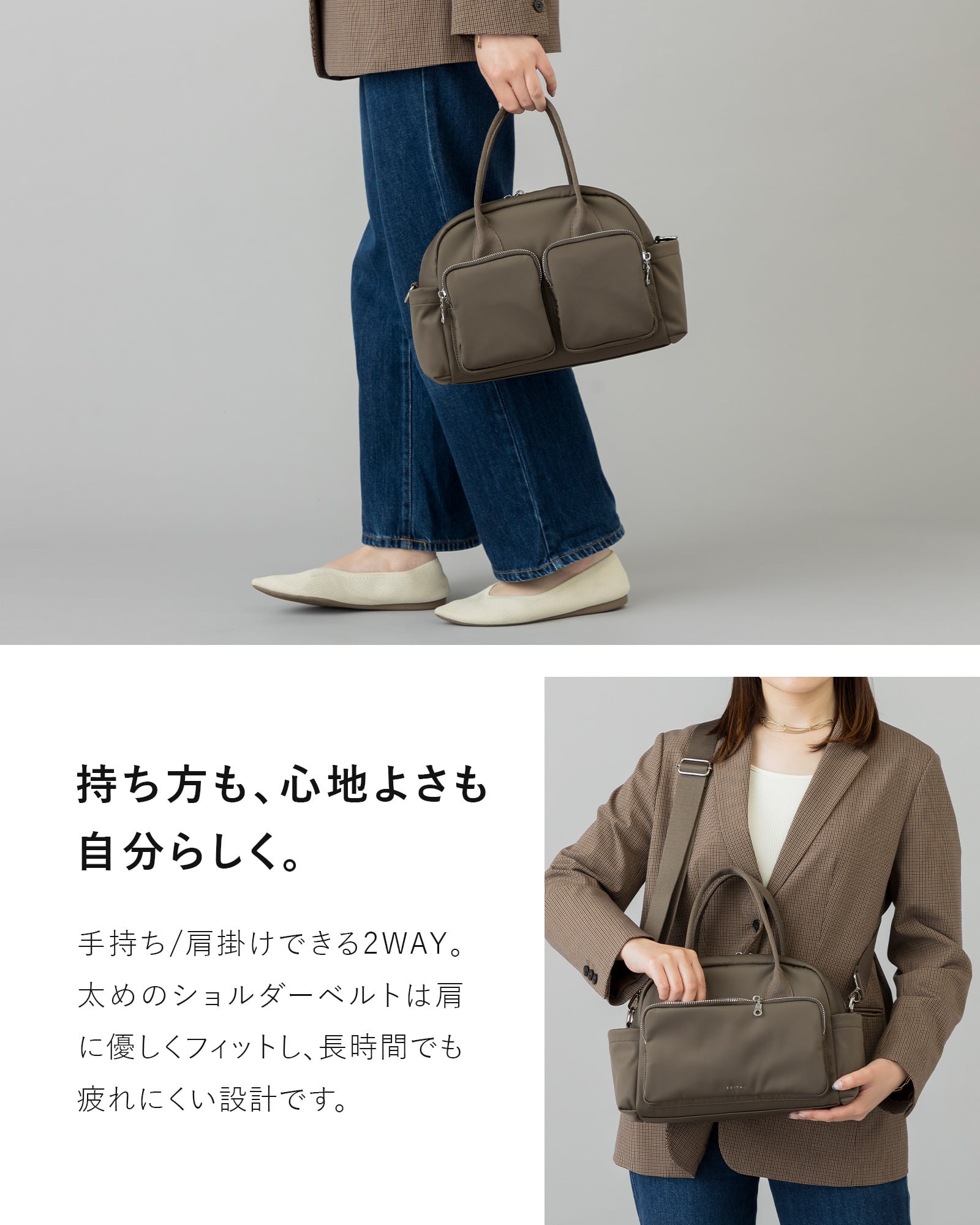 軽く柔らかい2wayトート。ダブルファスナー開きで、中の物を探しやすいのが魅力です。ちょっとお出かけにピッタリなサイズ感と、5つの収納ポケットを備えた機能性が◎防水生地でお手入れ簡単。毎日気軽に使いやすいアイテム。