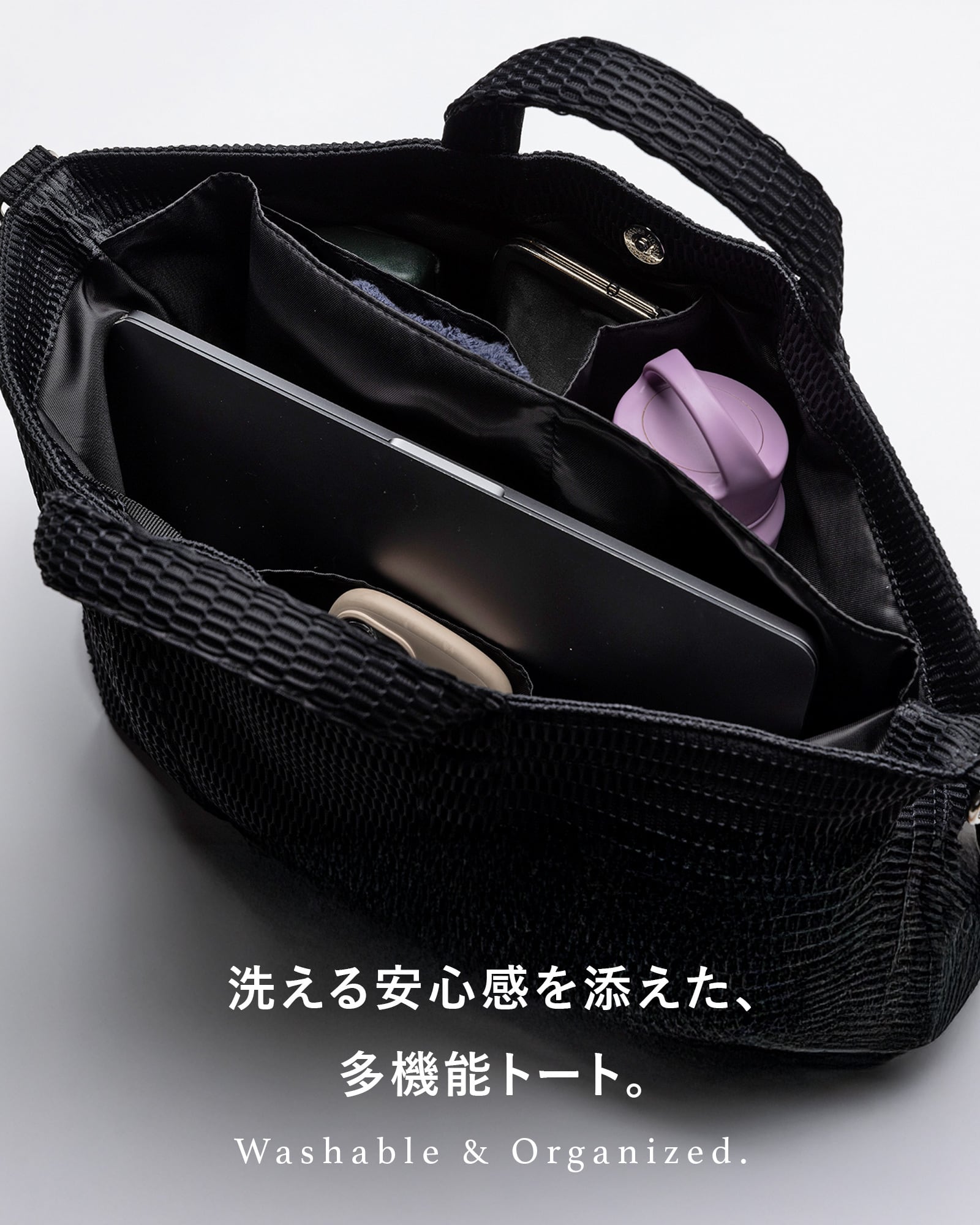 大人気のポケットたくさんトートに洗濯機で洗えるタイプが登場!A4収納OKで内外計9箇所のポケット付きなので、小物の入れ分けができて便利。いつも衛生的に使いたいエコバッグやマザーズバッグ、ジムバッグ、通勤・通学、1泊程度の短期旅行など幅広いシーンで活躍間違いなし。