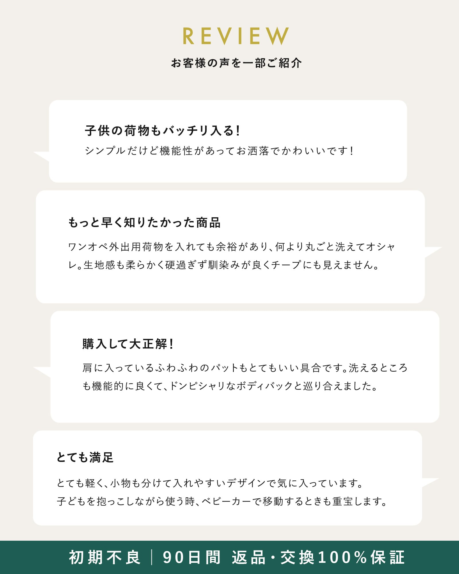 シンプルで洗練されたデザインだから、どんなスタイルにも合わせやすいです。街歩きバッグとしてはもちろん、マザーバッグや旅行用のサブバッグとしても便利です。カジュアルからきれいめまで、様々なシーンで活躍します。