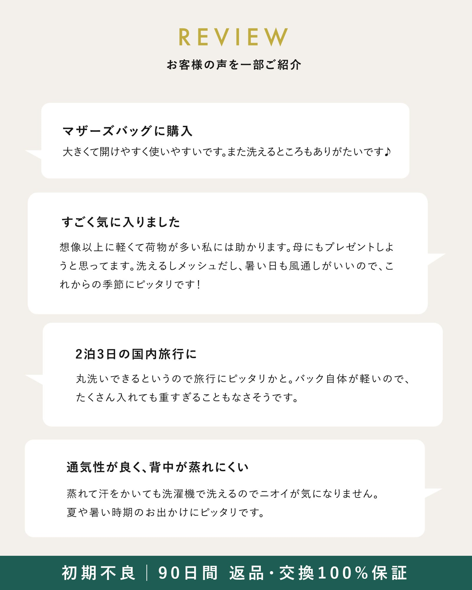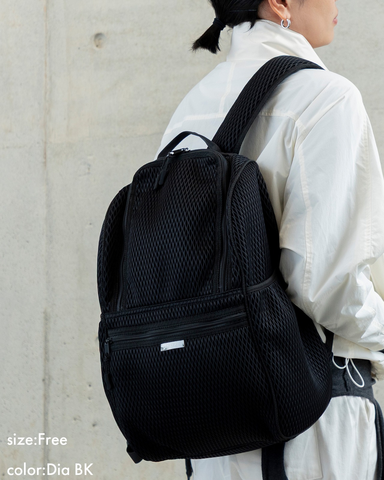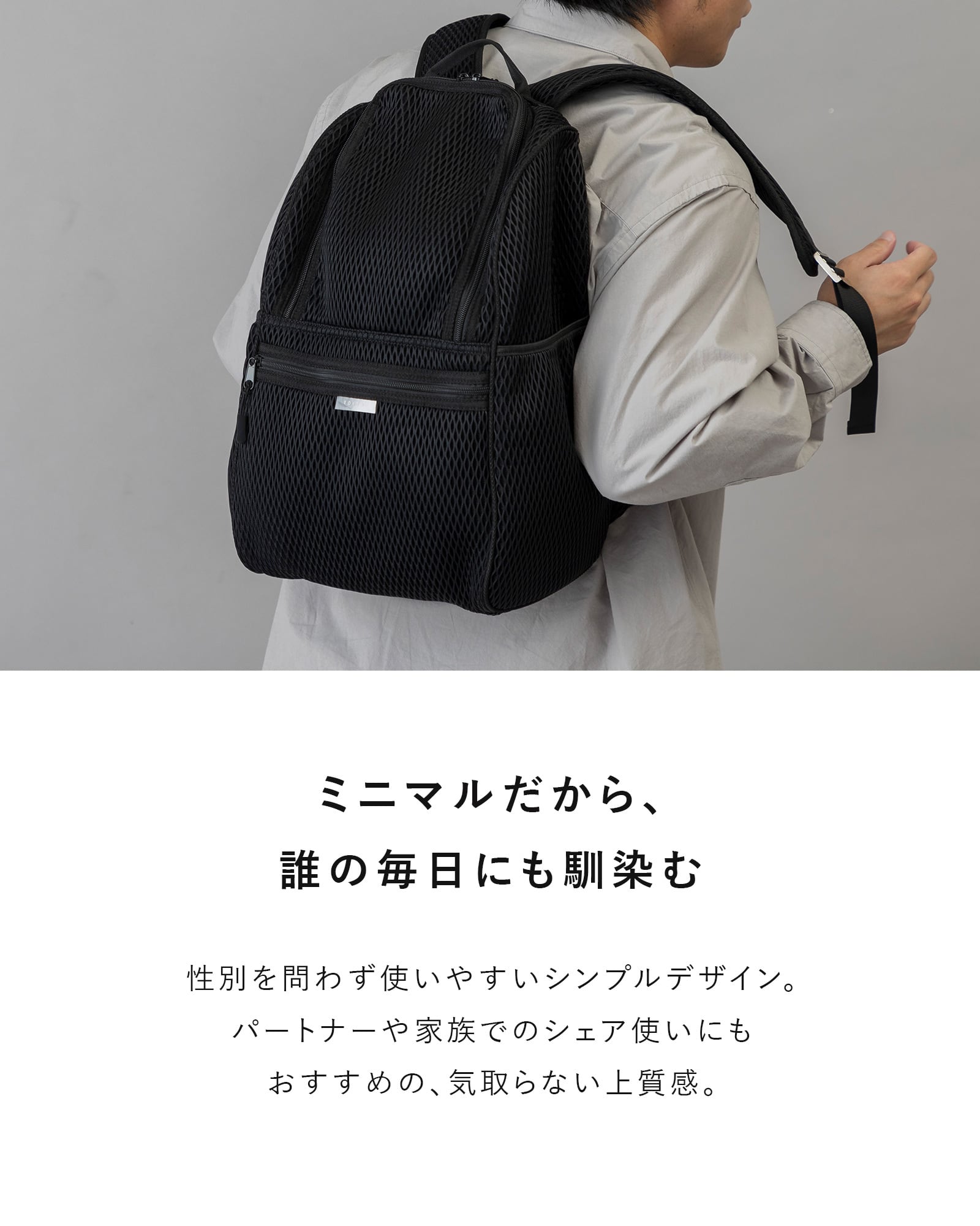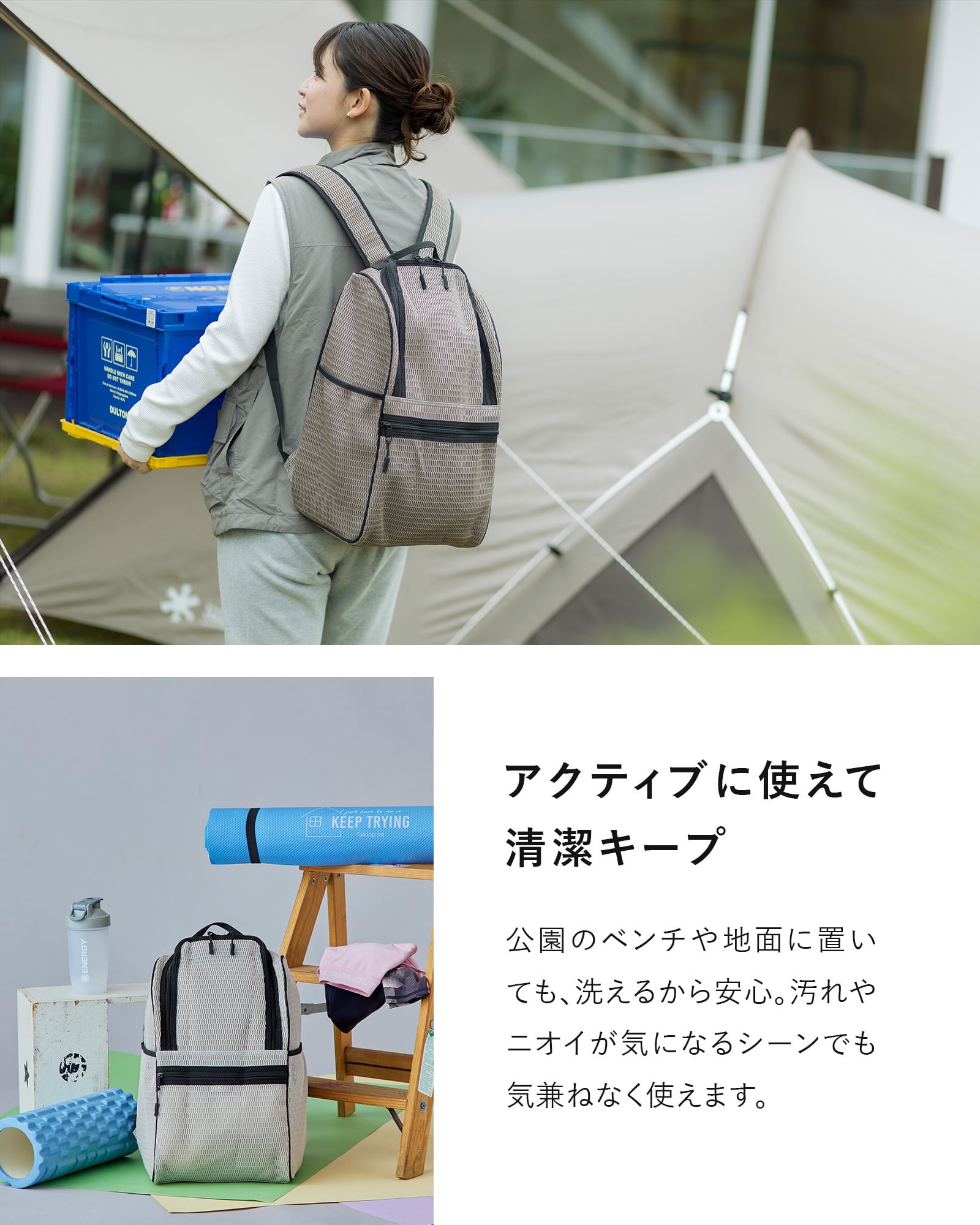 メッシュ素材を使用したウォッシャブルなデイパック。軽量で持ち運びがしやすく、シンプルなデザインながら多機能。日常のお出かけや旅行、アウトドアシーンなど、さまざまな場面で活躍します!