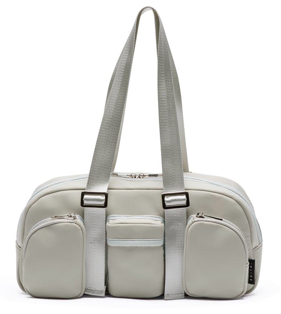 立体的なポケットを3つ付けた、トレンド感ある横長ハンドバッグ。